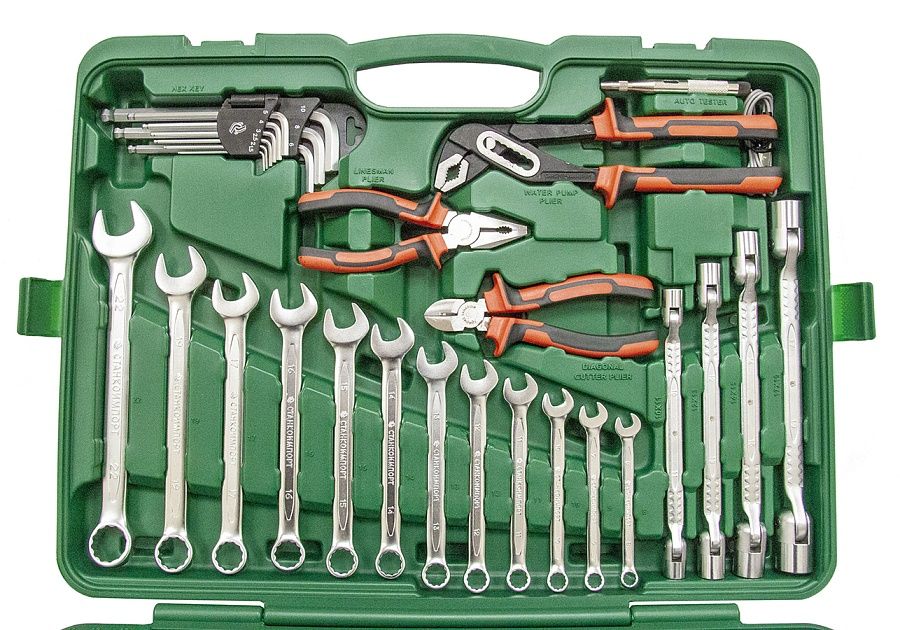 - Тип ключей в наборе: с комбинированными ключами, с угловыми шестигранными ключами, с двухсторонними шарнирными ключами