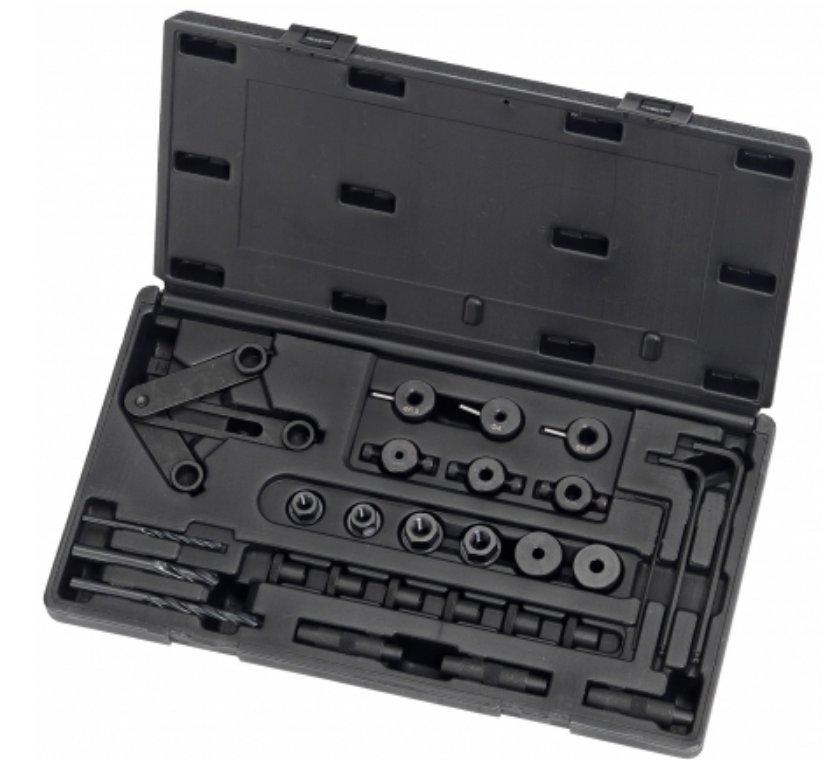 Данный набор включает в себя все необходимые приспособления для извлечения сломанных и поврежденных шпилек на головках блока цилиндров и выпускных коллекторах.