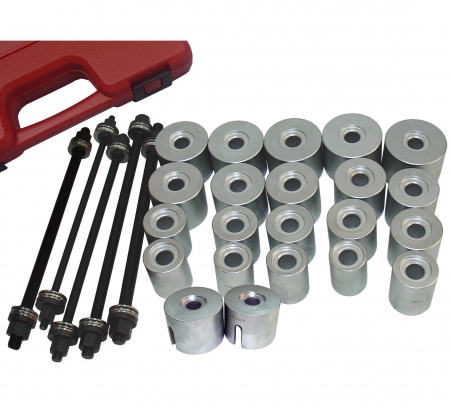 Комплект приспособлений которые позволяют производить работы по замене подшипников и сайлентблоков. Применение оправок из набора сащественно упрощает процесс перепрессовки.